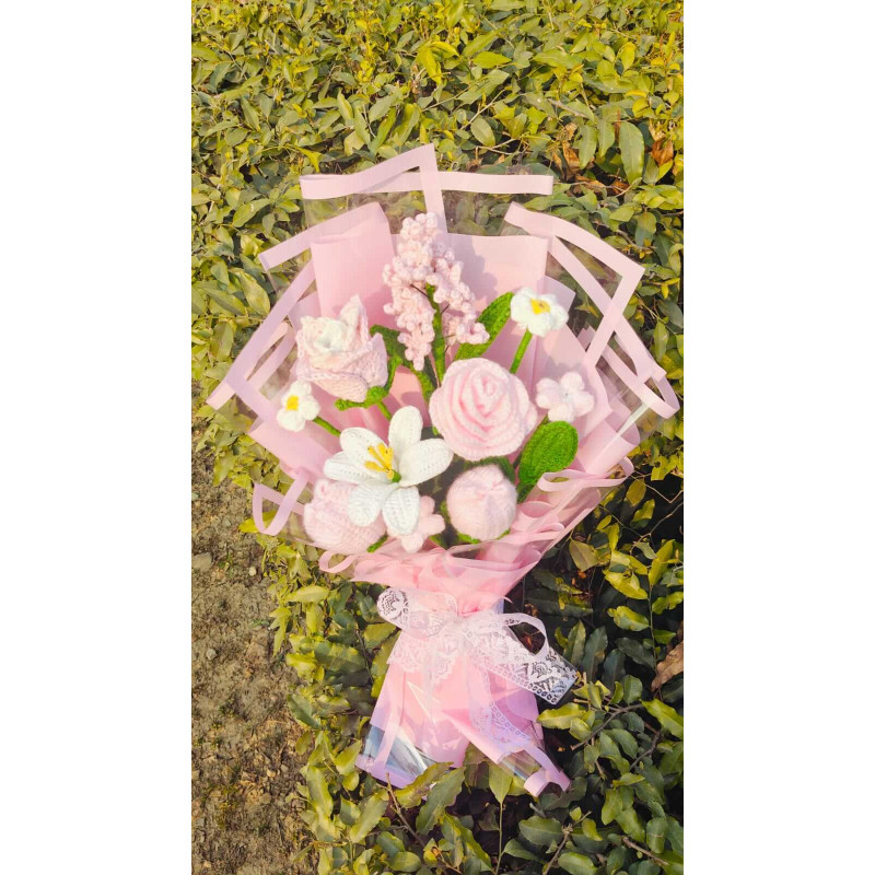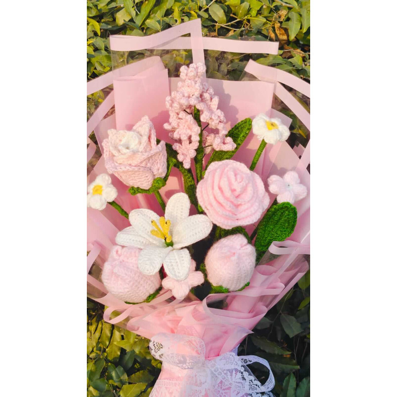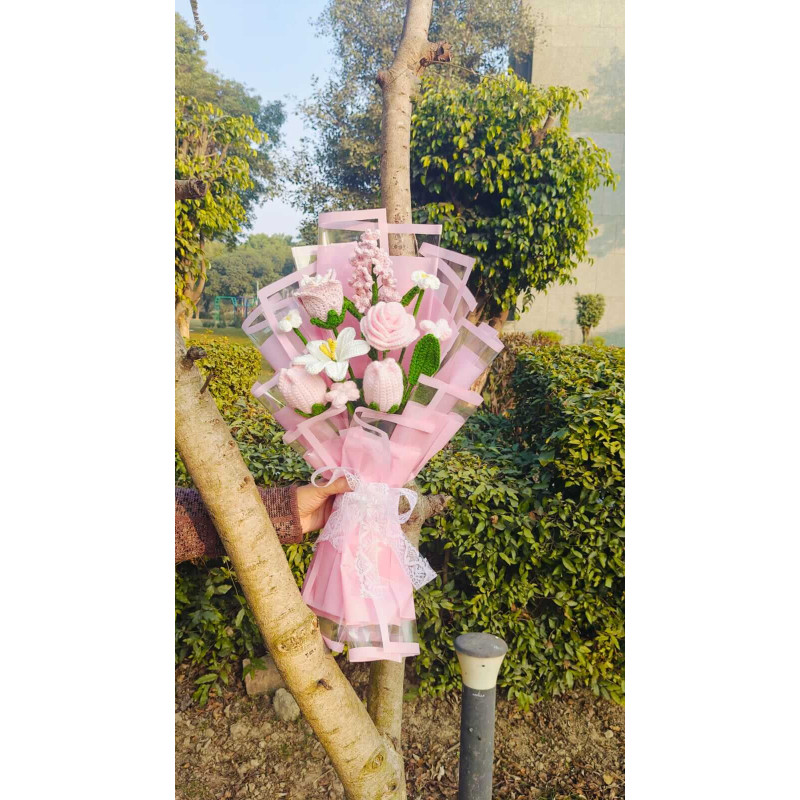 Pinkette Petals is a whimsical, handcrafted bouquet featuring soft crochet lilies, roses, and tulips in a delicate pastel palette. More than just a floral arrangement, it serves as a timeless, maintenance-free piece of decor that never wilts or loses its charm. Finished with frosted wrap and a lace bow, it’s the perfect everlasting gift for those who value sustainable elegance.