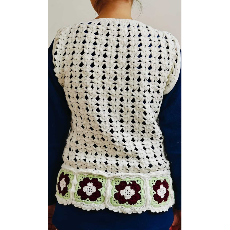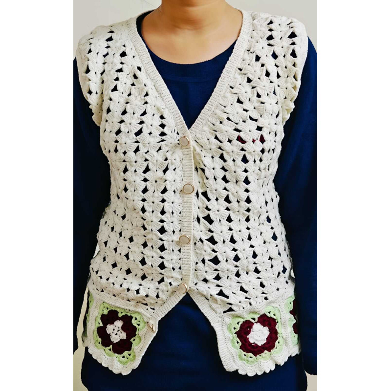 The Cream Carnation is an artisanal V-neck waistcoat blending a delicate diamond-lace bodice with vibrant floral medallions. This lightweight, breathable layer transitions effortlessly from casual brunches and garden parties to festive evening gatherings. Highly versatile, it can be styled over a sundress for a bohemian vibe, paired with a crisp shirt for a polished office look, or layered over a turtleneck to add handcrafted elegance to cooler days.