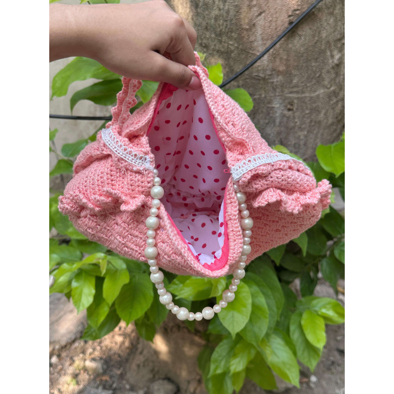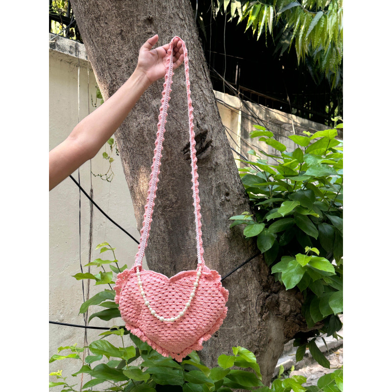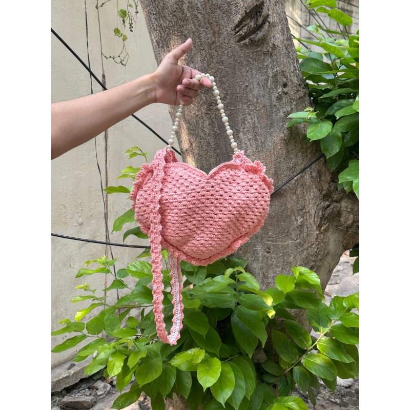 The Pearl Crush Pouch is a handcrafted heart-shaped statement piece featuring elegant ruffled edges and a delicate pearl accent. Designed to hold your essentials like a phone, keys, and lipstick, it’s the perfect accessory for brunch dates, weddings, or whimsical photoshoots. Wear it crossbody over a floral sundress for a romantic look, or style it as a shoulder bag to add a soft, artisanal touch to your evening ensemble.